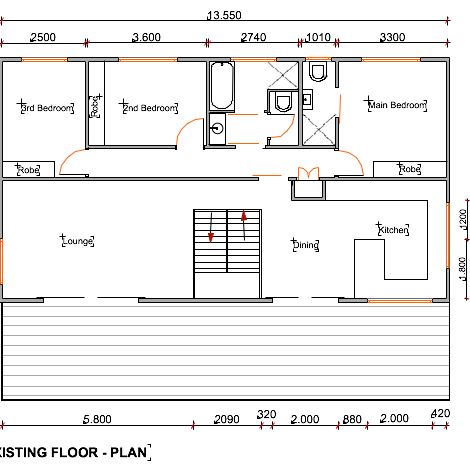 Stage 1 is to renovate the 1st floor, which is the living area, kitchen, 3 bedrooms, the main bathroom and an en-suite. The current floorpan shows a staircase that lands in the middle of the living space where the kitchen is on one side and the other side the lounge room with no room for a dining table.
