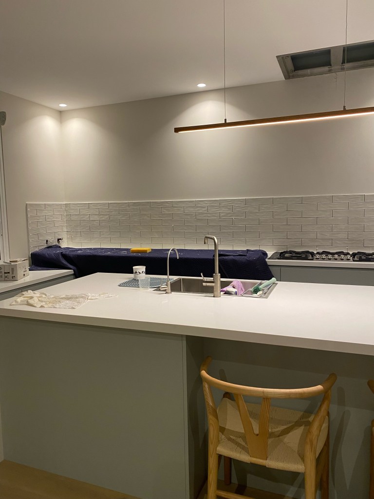The ground floor kitchen has a soft palette with a touch of timber to add contrast. The walk-in pantry has mainly open shelves and a functional work area with a sink and additional draw dishwasher.