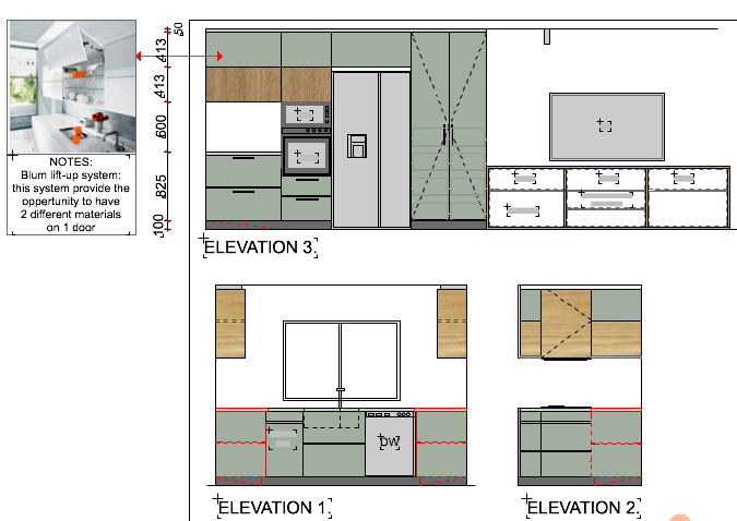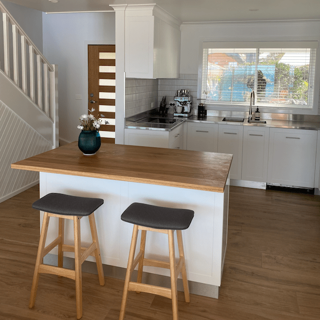 When it came to select the colours for the kitchen cabinets, we played with several natural cabinet finishes but at the end the owners decided for the colour white to keep in simple, with a stainless steel bench-top and a timber top on the island bench.